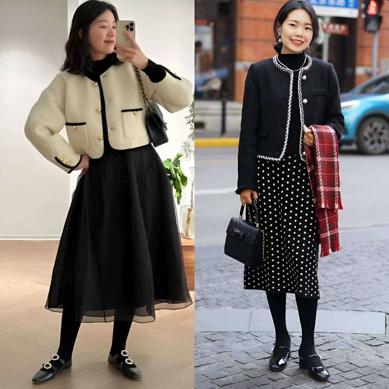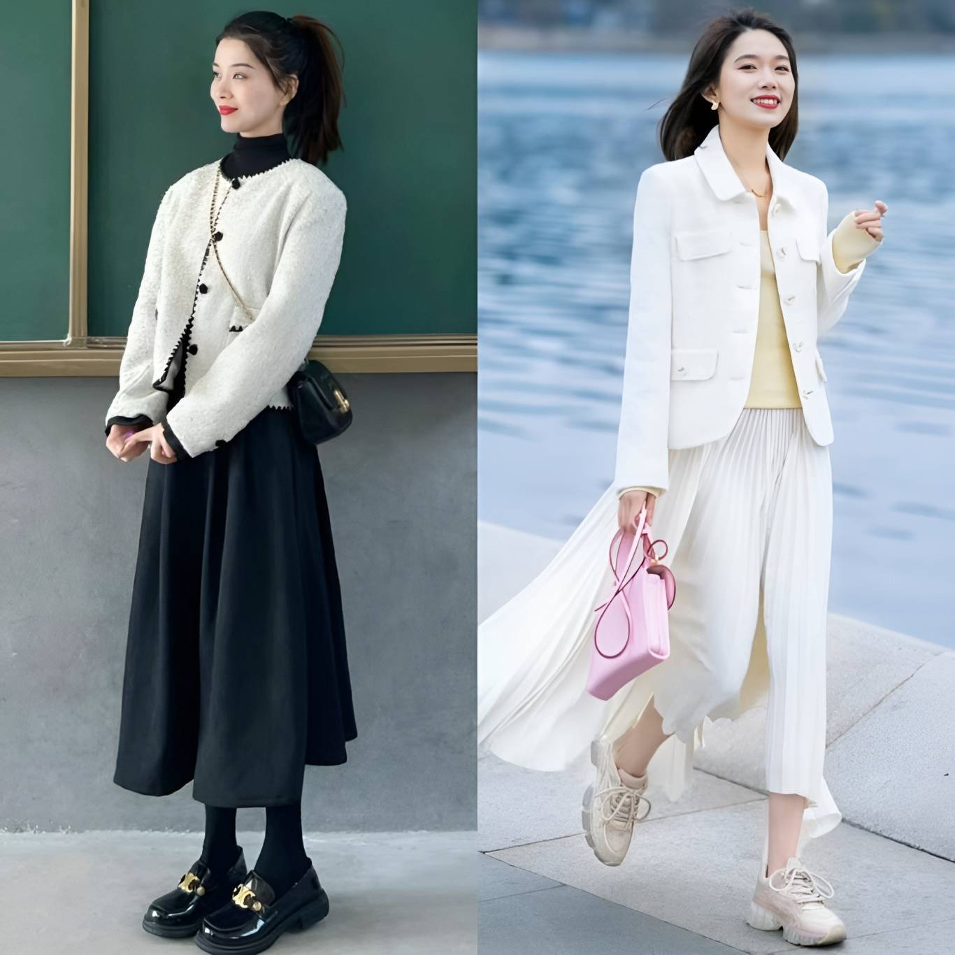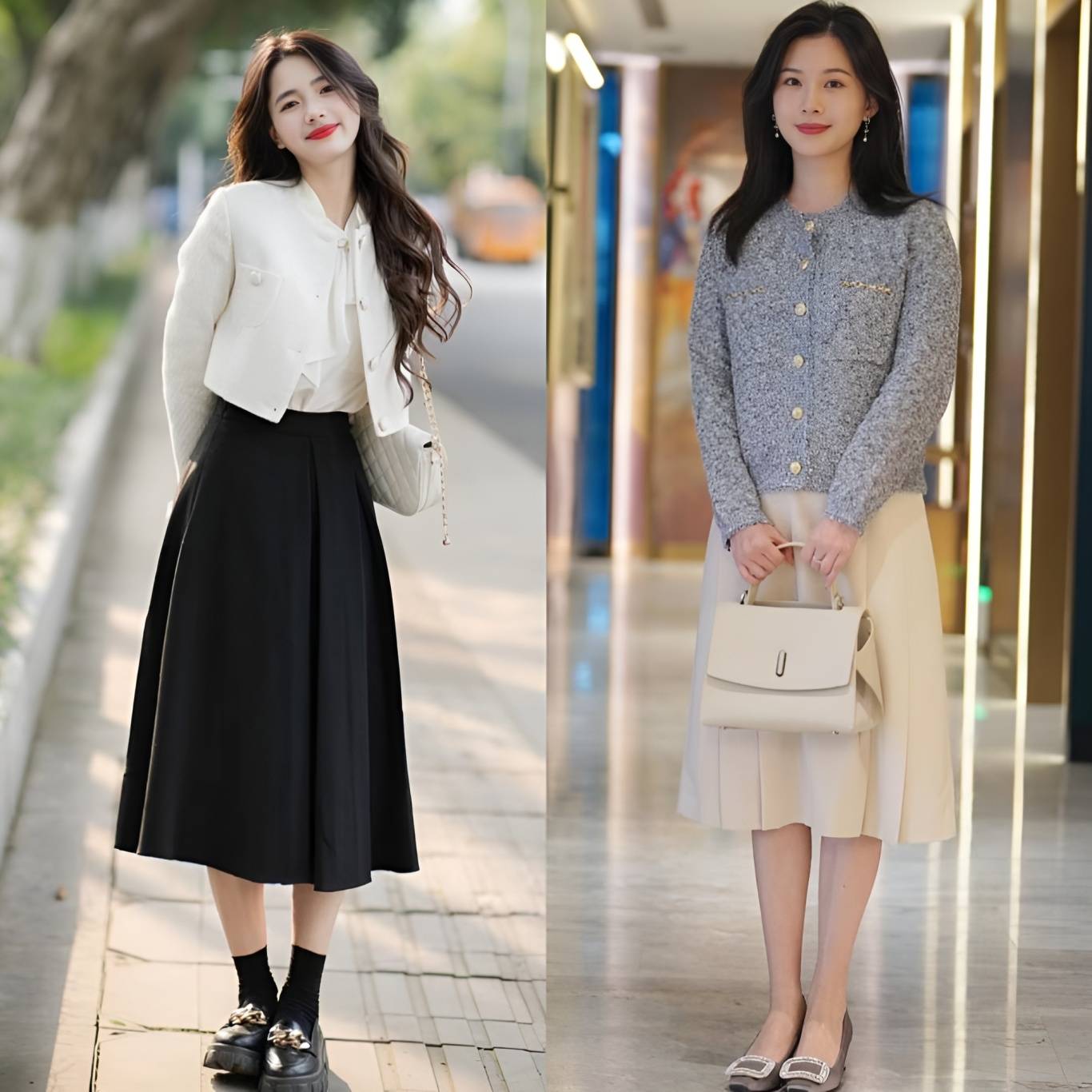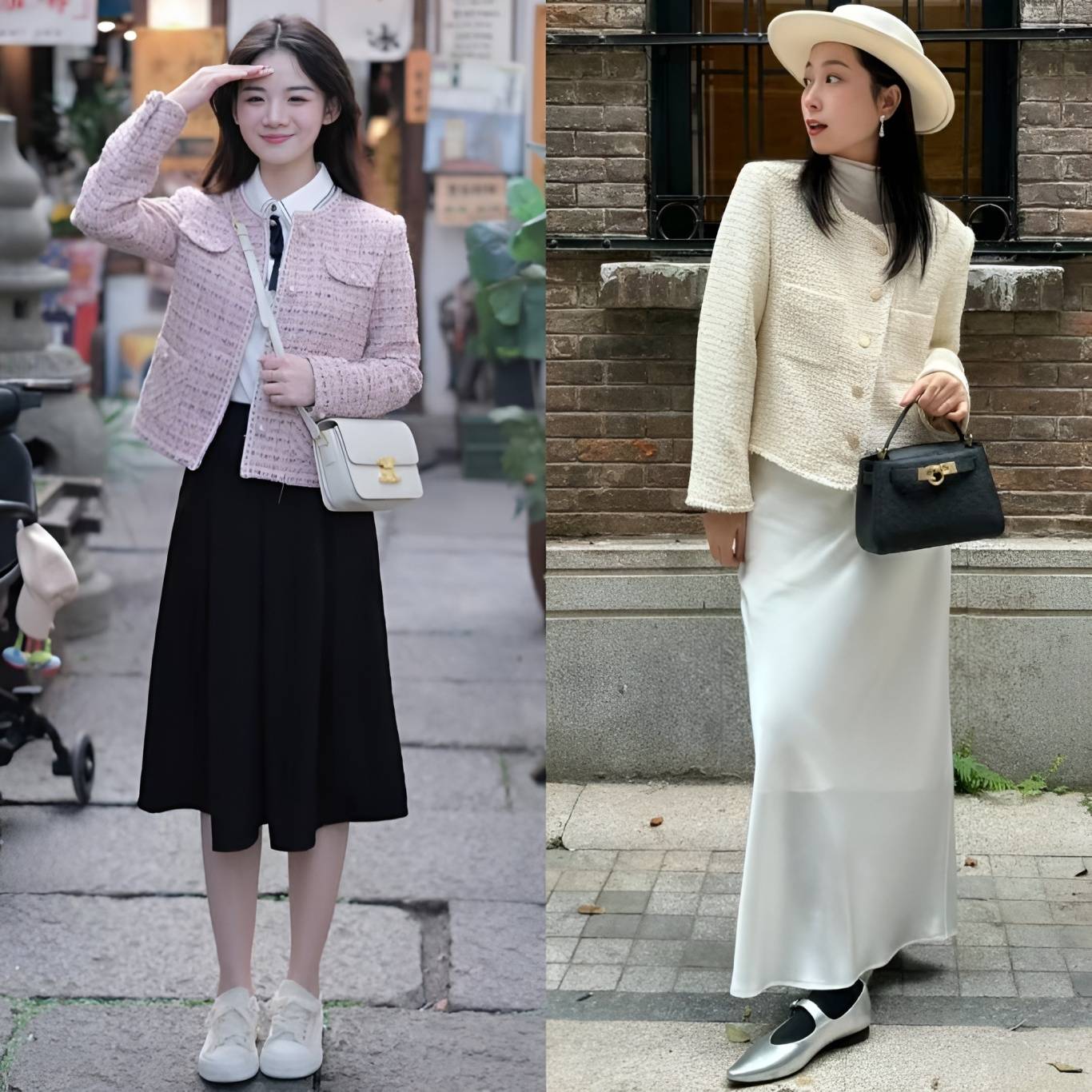这主要归功于裙装在视觉上更加轻盈、飘逸的特点。裙子的流动性强,能够有效拉长下半身线条,营造出一种高挑的错觉。相比之下,裤装往往更加贴合腿部,容易暴露出身高的短板,尤其是在搭配厚重感较强的小香风外套时,更容易显得沉闷和压抑。