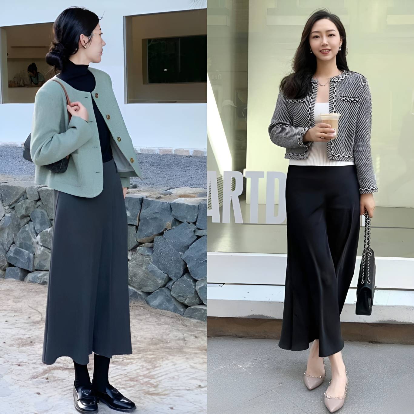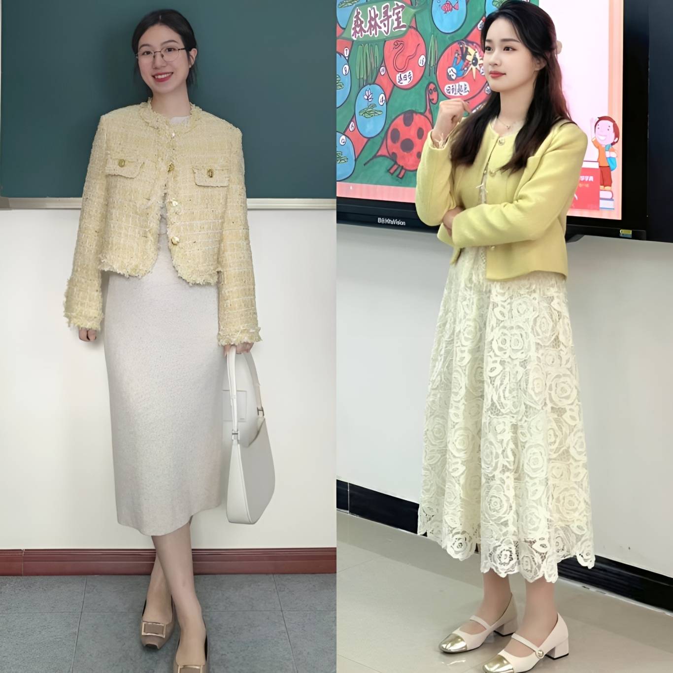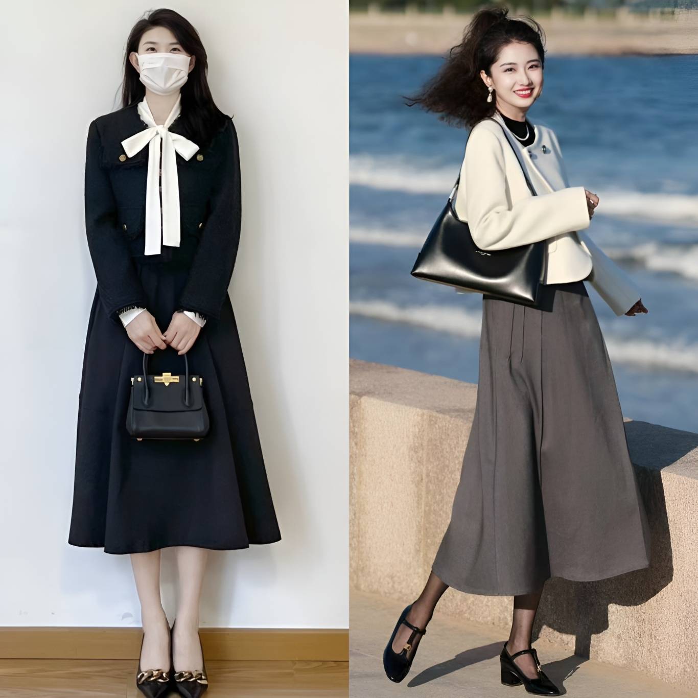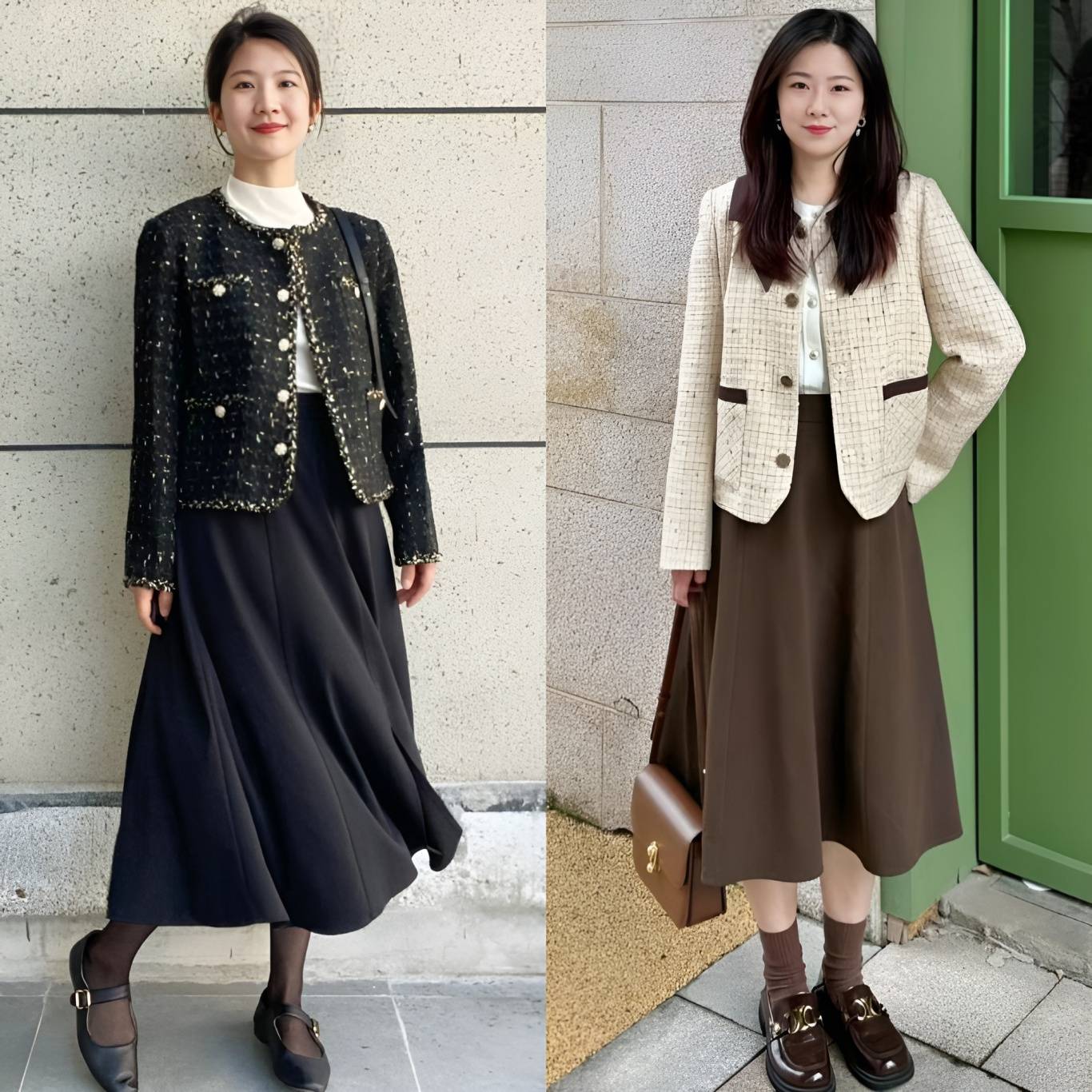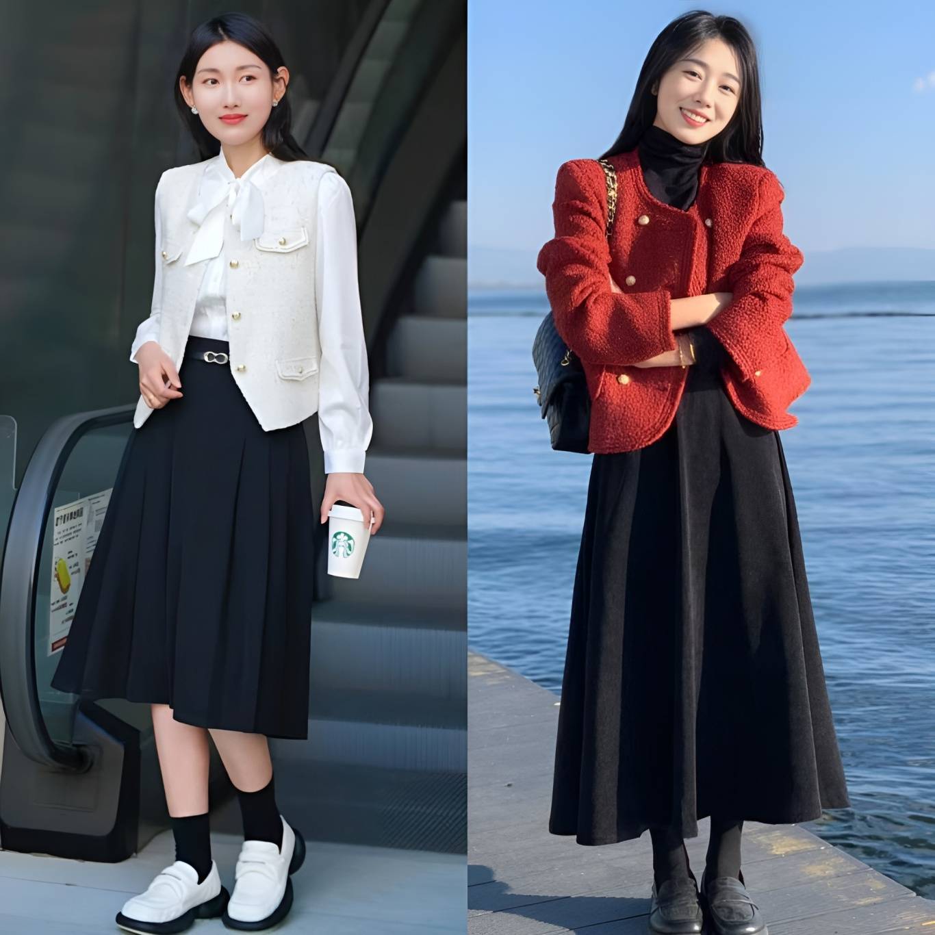 这主要归功于裙装在视觉上更加轻盈、飘逸的特点。裙子的流动性强,能够有效拉长下半身线条,营造出一种高挑的错觉。相比之下,裤装往往更加贴合腿部,容易暴露出身高的短板,尤其是在搭配厚重感较强的小香风外套时,更容易显得沉闷和压抑。
