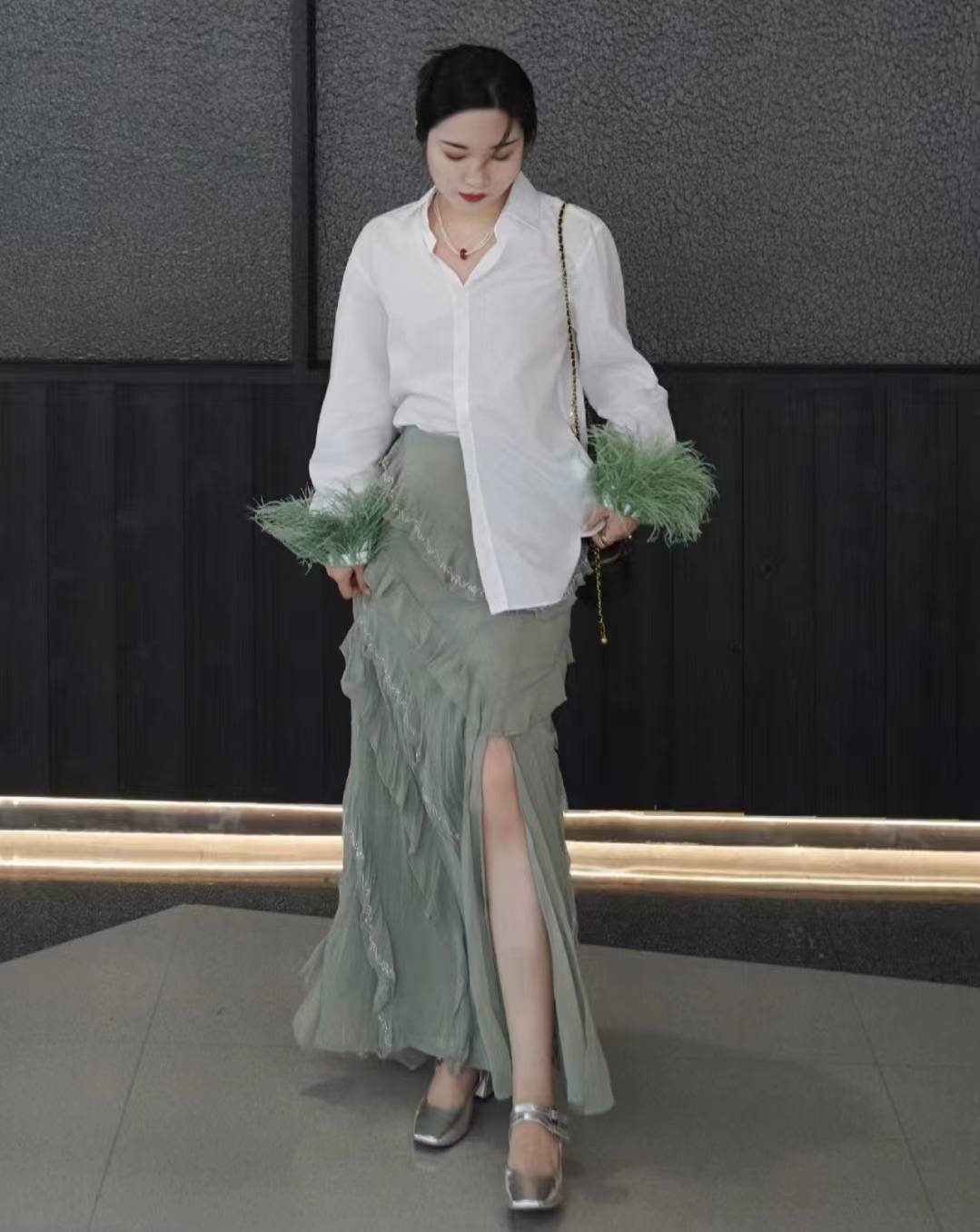 半身裙的长度可以根据个人身高选择,及膝或过膝的长度都是不错的选择。这样的穿搭既适合办公室也适合休闲场合。