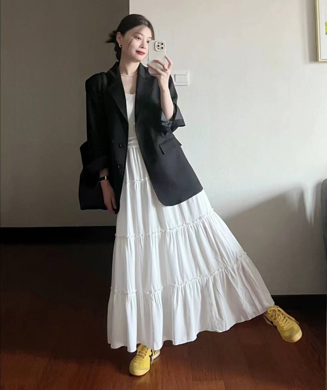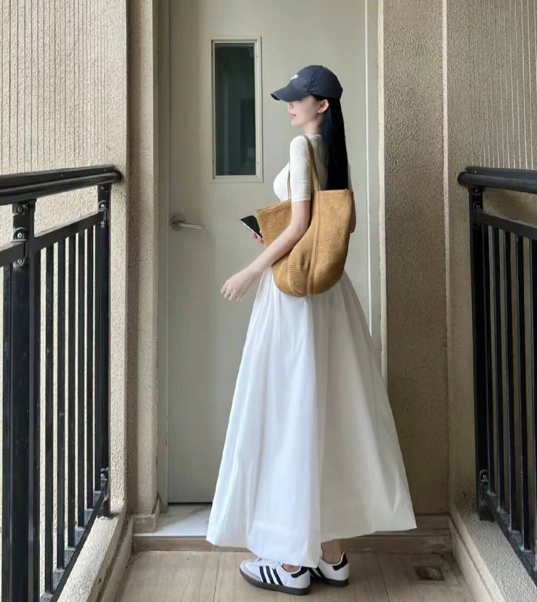 小白裙搭配白色背心,是同色系的经典搭配,给人一种清纯无邪的感觉。这种搭配方式特别适合夏日的海边度假或是悠闲的午后时光。吊带背心的简约设计与小白裙的优雅风格相得益彰,无论是漫步在沙滩上,还是坐在咖啡馆里享受下午时光,都能成为一道靓丽的风景线。