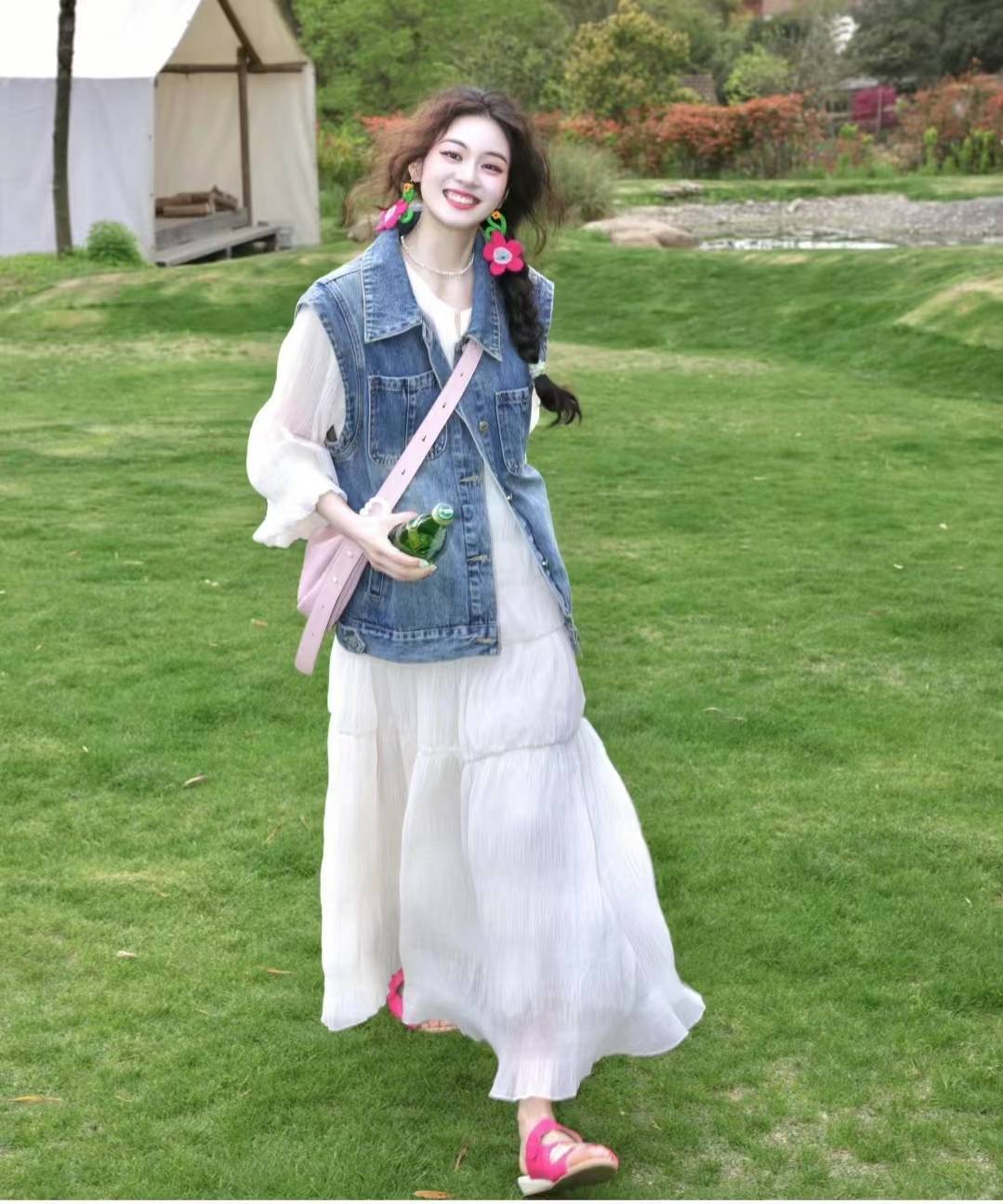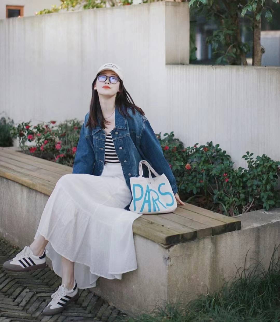 小白裙与蓝色牛仔外套的组合,是经典与时尚的完美结合。牛仔外套的随性与小白裙的优雅相互碰撞,既展现了女孩的率性,又不失温柔气质。这种搭配非常适合日常的休闲活动,如购物、约会或是和朋友们的外出聚会。